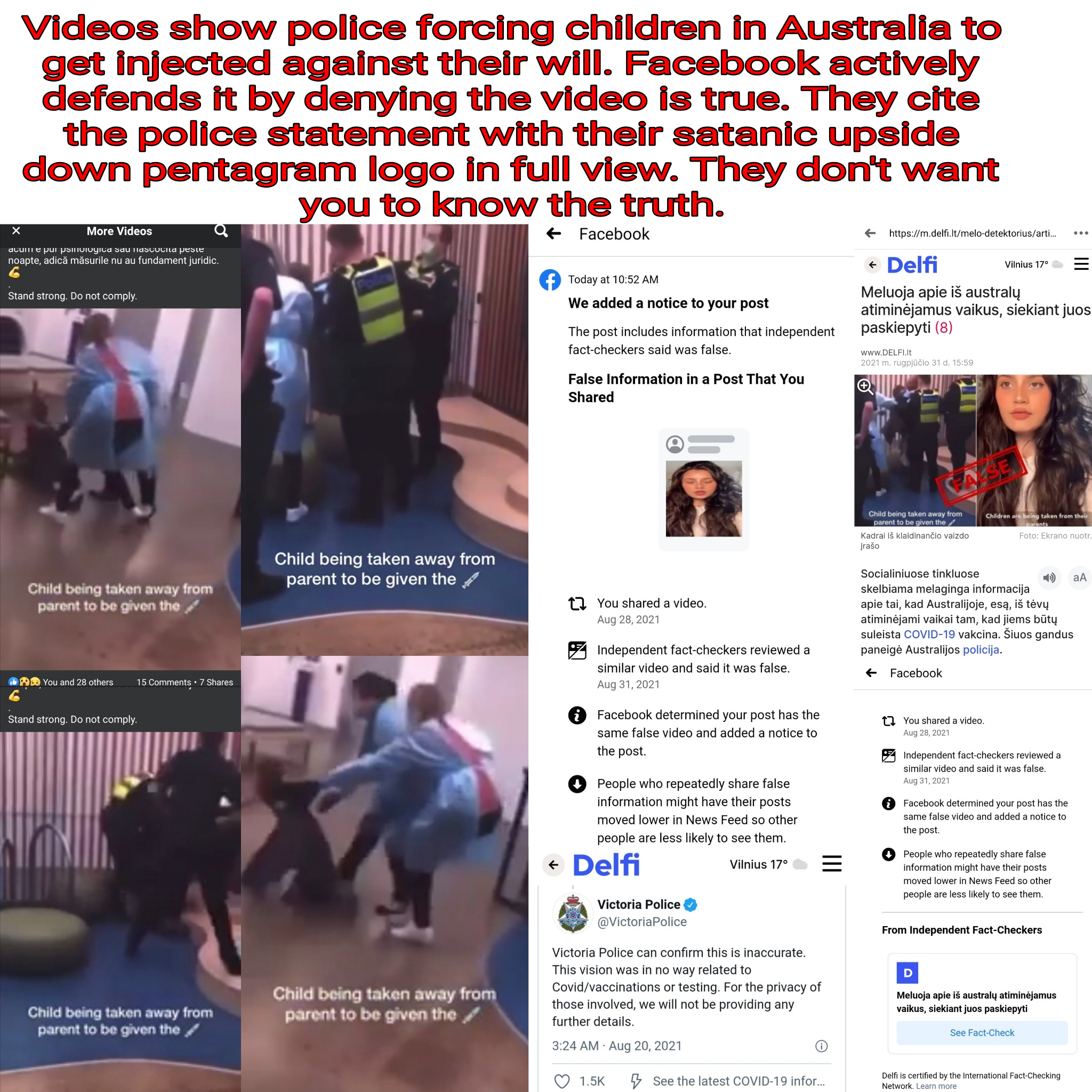 Police in Australia are force injecting children against their will. The camera shows children screaming no and trying to run away. Fact Checkers say this didn't happen because the police said it didn't happen.